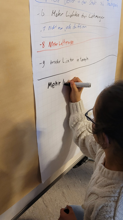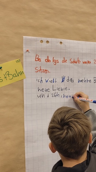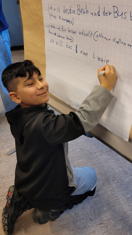 Im Anschluss begann die inhaltliche Arbeit: Am Computer sammelten die Kinder zentrale Themen, die ihnen besonders wichtig waren. Daraus entstanden Stelltafeln mit Schwerpunkten wie Müllvermeidung, Bus und Bahn, Spielplätze, Verkehrssicherheit sowie saubere Toiletten.