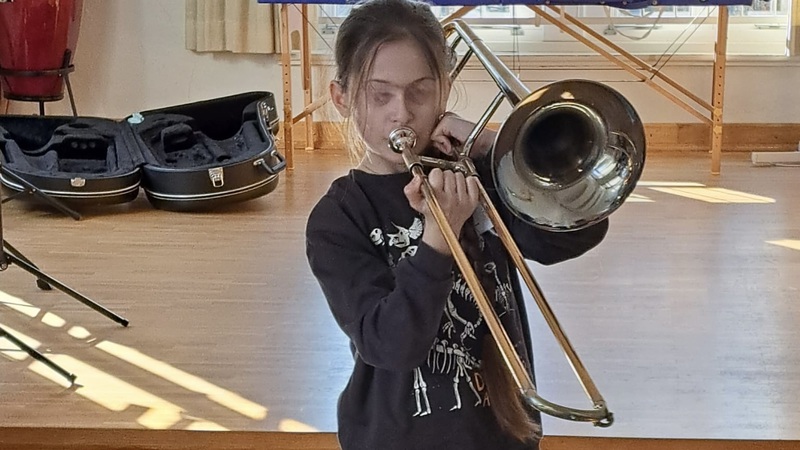 Anschließend konnten wir, von den netten MusikschullehrerInnen in 2 Gruppen eingeteilt, alle möglichen Blasinstrumente und Streichinstrumente ausprobieren. Das machte uns großen Spaß, und überraschenderweise war es die Kleinste, die auf Posaune und Trompete die größten Töne herausbrachte! Überhaupt gelang es den Kindern besser als den Erwachsenen ;); Wir pressten und pusteten, bliesen und babbelten - ohne Erfolg.