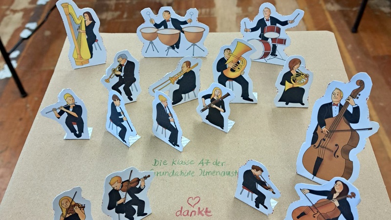 Am Schluss überreichten unsere beiden Klassensprecherinnen den Musikern noch ein von uns selbstgebasteltes Mini-Orchester. Beim Überreichen machten alle Musiker „Ooohhhhhhhh!!!“ - so sehr freuten sie sich über unser Geschenk. Beschwingt von so viel Musik fuhren wir zurück zur Schule.